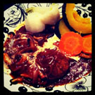 ふんわり。きのこのデミグラスソースに、蒸し野菜はカブ、人参、南瓜を添えて。