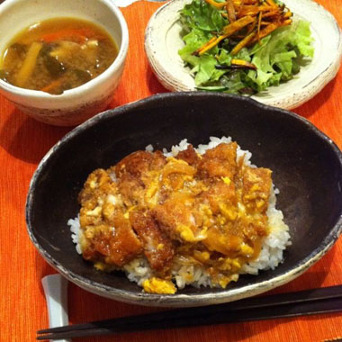 母の菜園で穫れたサニーレタスと自家製オニオンドレッシングのサラダ、それにわかめと人参、揚げのお味噌汁でカツ丼定食。こどもたちもコーヘイくんも、ぺろりとたいらげてくれました。