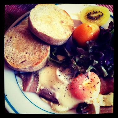 そんなある日の朝ごはん。GOOD FOODのよしみちゃんが休みの日に通りがかりに家まで届けてくれた天然酵母の自家製マフィン。ライ麦入りでしょっぱい朝ごはんにはぴったり。目玉焼きとサラダと、びわとキウイ。それに豆乳バナナジュース。