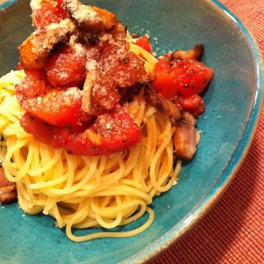 先週末の簡単晩ごはんはトマトとベーコンの冷製パスタ。