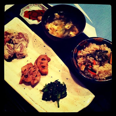 それにれんこんのきんぴら、ほうれん草のごま和え、蕨の炊き込みごはん、お揚げさんとわかめのお味噌汁。