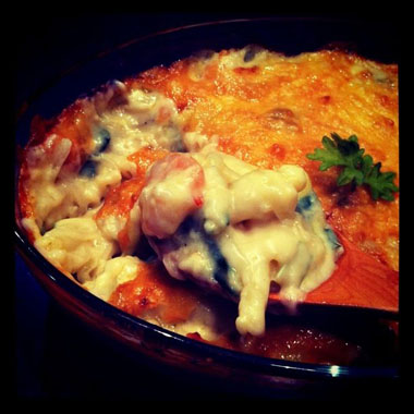 畑で穫れたうまい菜(知ってます?とっても甘いの!)とエビのマカロニグラタン。