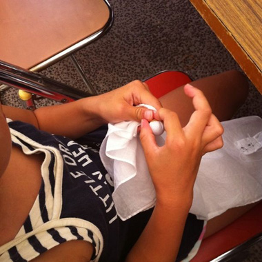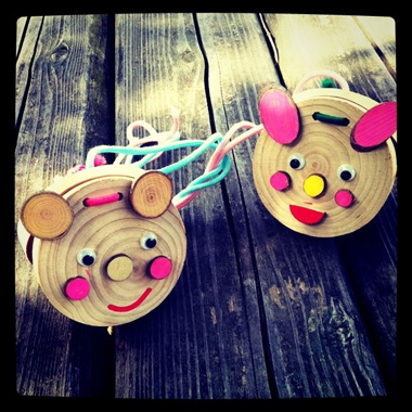 首に下げるひもをつけて完成。この日からしばらく、毎日どこへ行くにもカスタネット連れ。