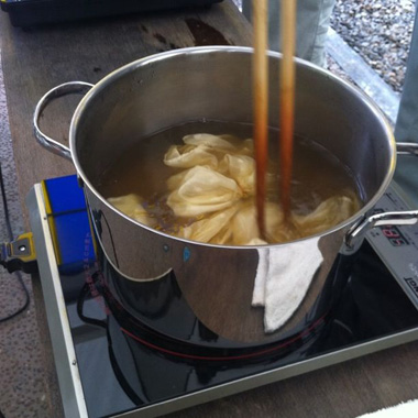 鍋で煮染めます。これはネムノキの葉で作った染料。