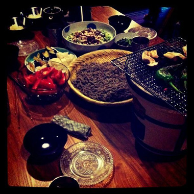 夜は料理上手の亜紀さんに教えてもらいながら皆で打ったお蕎麦を食べ、野菜を七輪で焼いて、揚げ餅や揚げ茄子、棒棒鶏サラダをたっぷりご馳走になって、またもやいろんなおしゃべり。